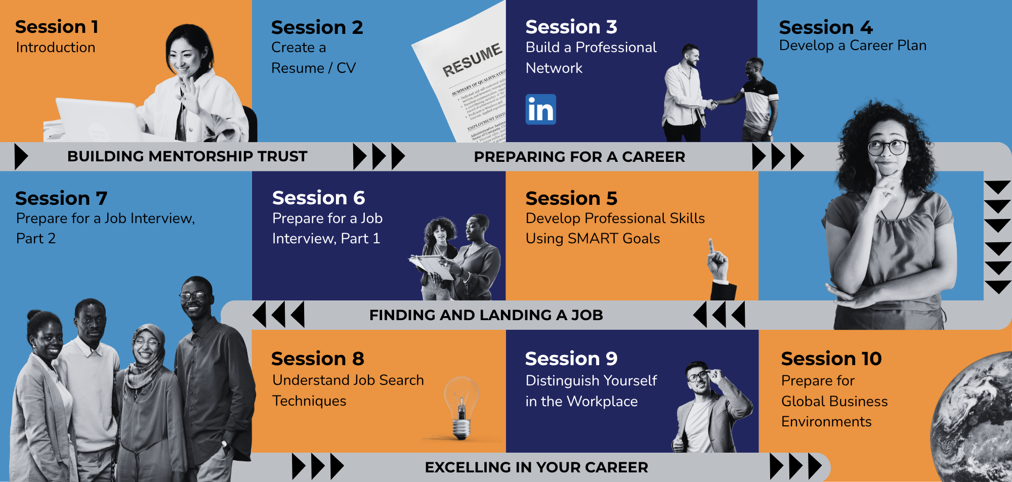 The GMI career readiness mentorship program follows a structured and easy-to-follow curriculum that can be adapted for each unique combination of student and mentor. All mentorships cover the same content to ensure measurable impact for students and supportive guidance for mentors. This program allows mentorship pairs to build affinity organically, fostering true human connection that transcends difference.